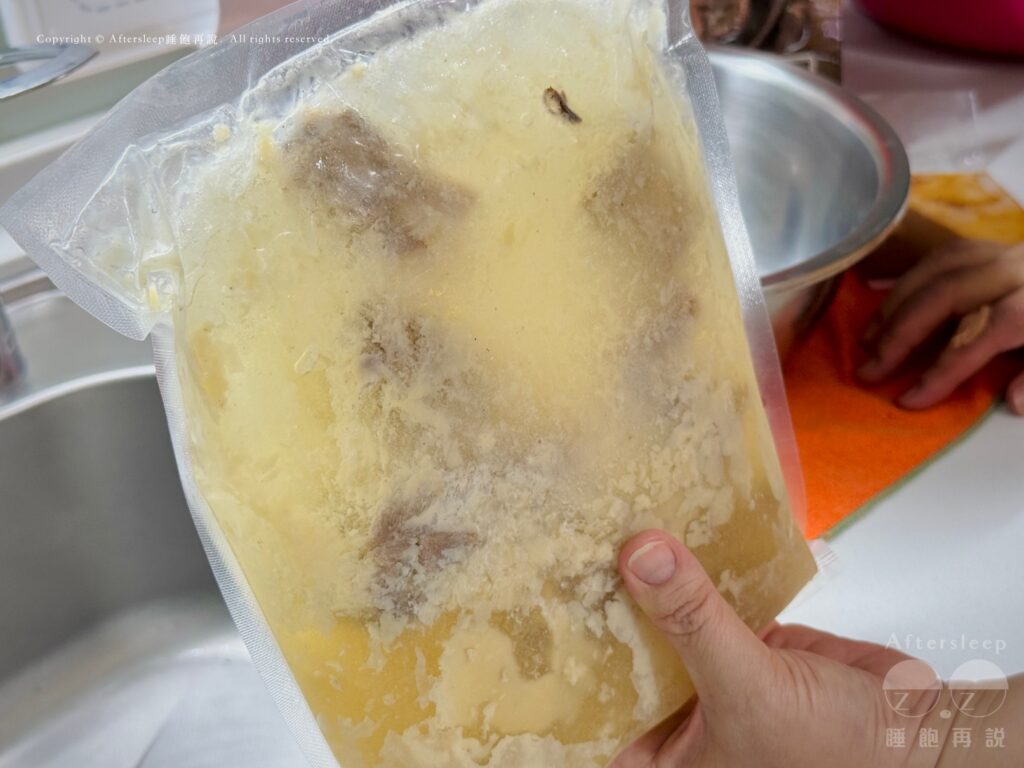 倒入鍋中並拿到瓦斯爐上加熱,加熱過程中會一直聞到舒服清甜的氣味,而且看湯頭的色澤就覺得超級好吃~裡面的肉肉煮開後比想像中還要豐盛,好期待等等加入蔬菜開吃